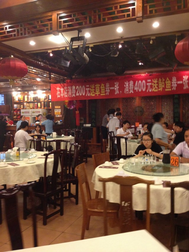 环顾了一下大厅,还挺宽敞的,正中挂着活动条幅:消费满200元送草鱼券一张,消费400元送鲈鱼券一张。