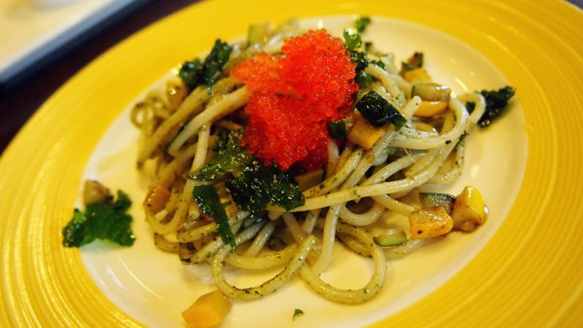 咦?意面?你没看错哦,这个真的是意面,现在许多商家都会推陈出新,结合各地的烹饪元素来创造属于自己店里的菜肴,我想这道紫苏风味的牛油果飞鱼子意面就是了吧.听上去怪异的名字但是入口也并非有想象中的那么怪异啦~其实他的口感也是比较偏向于我们一直吃的青酱意面啦,不过这道面里还能感受到牛油果的油润感觉和飞鱼子在口中活泼的蹦跳感受