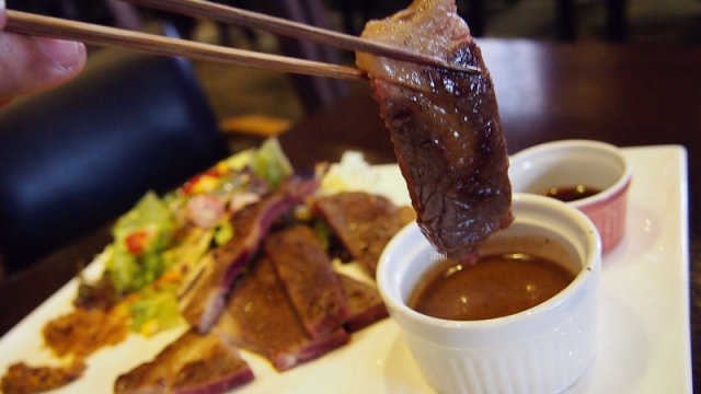 当当~这个应该就是这次用餐的主角了吧!T骨大牛排!整块牛排有团子三个巴掌那么大,端上来的时候好震惊,经过前几道美食的轮番轰炸,看到这道大牛排的时候仍然很有食欲~因为大牛排旁边配的是团子最爱的蔬菜色拉~团子男友对团子这种终于可以吃到草的神情极度地鄙视了一番后就去啃他的肉肉了,据他说肉肉味道很美,但可惜的是可能火候有点大所以稍微有点老,但是我表示我在一边啃草啃得很开心!