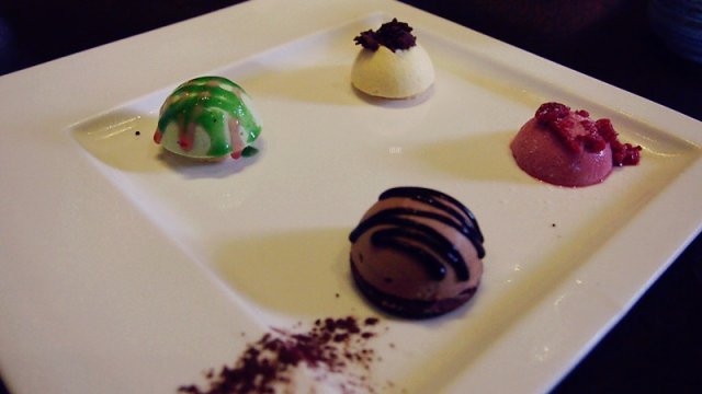 饭后当然还要有美美的甜品来满足自己的第二个胃啦.这家的甜品是四种不同口味的MINI小蛋糕,咖啡口味的味道很浓郁,奶油口味的也香香,还有开心果味道的,我表示已经很久没有吃到过开心果味道的甜品了,所以对这个味道还是瞒感怀的,不过我男朋友吃不惯这个口味,他是洋泾浜,嘘~覆盆子的我表示很可口,但是男友表示有点酸,看到他吃了一口后整张脸拧一起的感觉我好想笑.