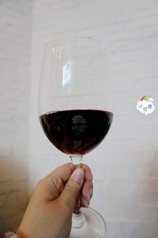 偶要的饮料是斐济矿泉水。。比较清爽。朋友点的红酒。酒杯很有趣,倒入红酒后酒杯上就浮现出了教父的模样。。看见了么。