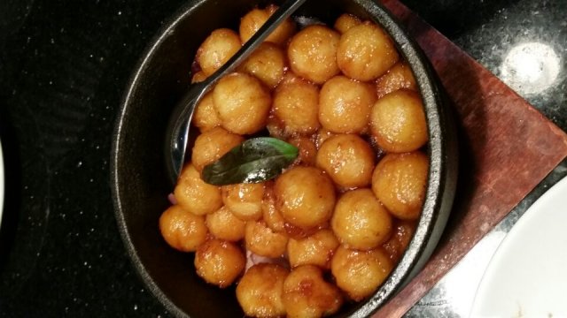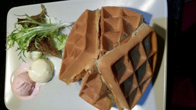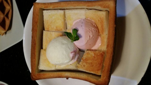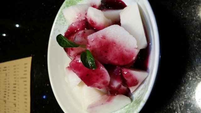 接着我们拿过菜单看了好久才挑选了几个菜,首先点的是蓝莓山药,我以为这道菜是像小鱼港餐厅做成泥状的,原来想错了,是切成了块状撒上的蓝莓汁,不过也很好,很爽口,嚼在嘴里很清脆。第二道点了冰淇淋面包那个,具体忘记什么名字了,总之就是正方体面包上有两个冰淇淋球,味道还可以吧,是热乎的,吃在嘴里比较松软,但是吃到最好会觉得很腻。第三道菜点的有点重复,也是面食类的,也是有冰淇淋和面包,不过这里的面包吃在嘴里的味道有点像我小时候吃的一元硬币那么大的烤的面包,味道很好,吃了还想吃,摆盘的造型不错,最后点了一个三杯汁小土豆,这个是我的最爱,超喜欢吃,吃在嘴里有点甜也有点咸,糯糯软软的,而外面有些焦的感觉,不是那种烤焦的,外焦里嫩,真是回味不穷啊,最后说说我点的米饭,这家的米饭和其他餐厅不一样,加了点其他的杂粮,不知道是小米还是玉米面,总之给人一种健康之感。