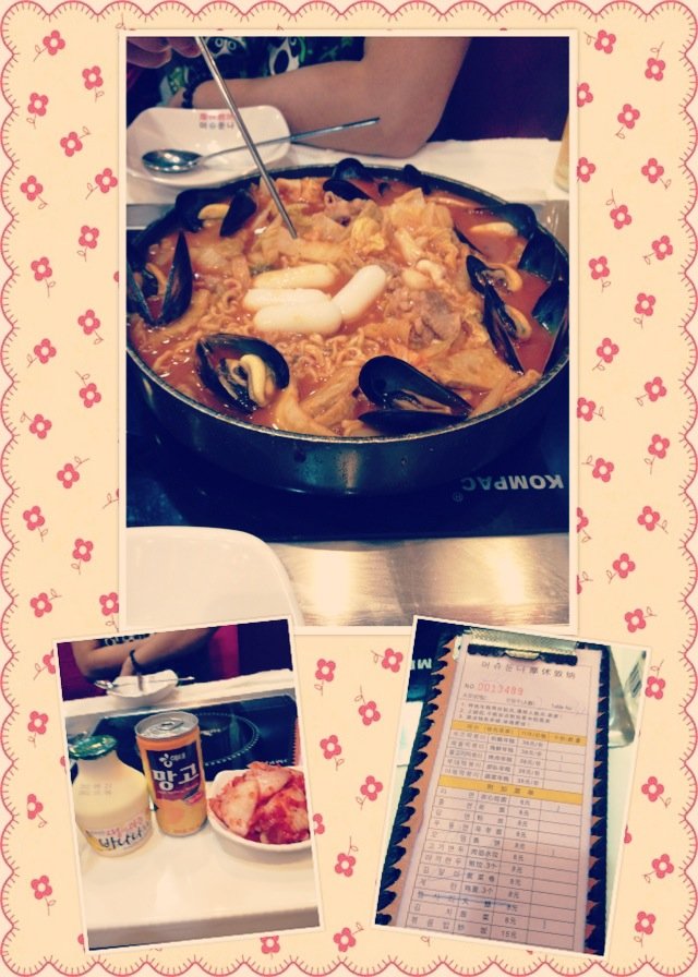这家店第一次吃是在日月光那边,地方不大,排队去很长,这家店好像是总店,地段挺好的,附近有挺多的日韩料理,就是地铁下来需要走些路。店面不大,路口排队的那家店肯定就是这家了,店挺小的,布局倒是很紧凑,除了走人的路,基本都安排了台子,2人座的偏多,去的时候晚上7点,大概等了半个小时不到,也还行。店里面韩国人吃的挺多的,想想也挺正宗的。年糕火锅的内容很丰富,点了海鲜和烤肉年糕,还加了必备拉面和南瓜年糕。味道那叫一个香,非常好吃,店里的饮料有特色的是香蕉和草莓牛奶,但是配年糕有些腻了。