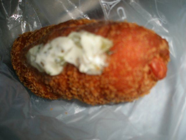 这个是色拉热狗,貌似是这个名字,但是不怎么好吃,上面的色拉酱加上面包本身有点油油的,所以口感不灵,里面的热狗肠也有点干。不喜欢。