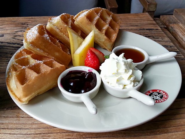 还配了奶油、蓝莓酱和蜂蜜。