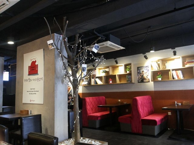 然后上来了火锅,看着像东西挺多似的,其实里面的东西很浅,我和闺蜜带来的小伙伴都是不太能吃辣的人,问了下可不可以做成微辣,服务员说不行,都是辣的,不能调。其实是可以调的,因为锅上面有一团辣酱完全是可以控制量的,服务员太木讷了,还很冷冰冰的-_,-......火锅里面的牛肉挺少的,没有几片,其余的就是鱼豆腐还有最廉价的没有馅的那种白色淀粉鱼丸,在然后就是非常多的胡萝卜,午餐肉只有很少的几片,好像还有杏鲍菇吧,切成方片的吃起来有点像杏鲍菇呢~还有圆白菜和四五个年糕。味道比较咸,辣酱太辣了,但是如果没有的话还不好吃。