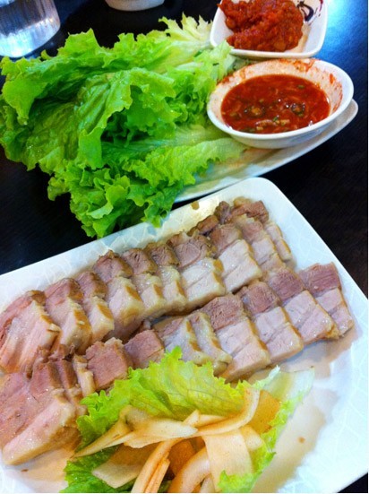 还有菜包肉,煮好的五花肉和传统的辣酱虾酱混合,配上腌制的萝卜,再用生菜卷起来,咬一口,特别清脆爽口,夹杂着肉香,非常有满足感。