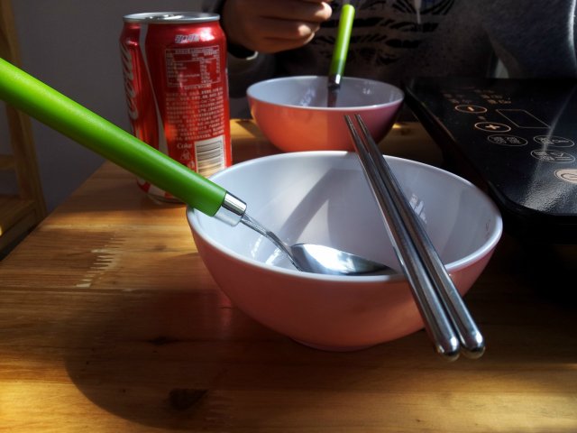 碗筷很有爱,是粉色的,感觉像幼儿园小盆友吃的碗。