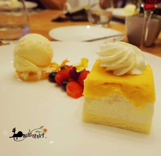 最后一道白薯慕斯蛋糕配梅子柚子冰激凌及糖渍柠檬,淡甜微酸,丰盛一餐完美收官。价格是198+15%服务费。