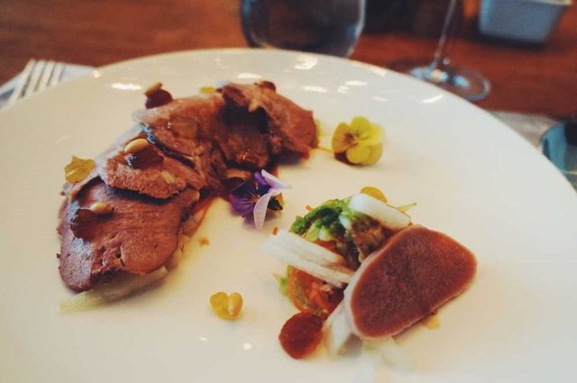 四道菜分别是牛舌沙拉配丰水梨及白泡菜及卷心菜,这道沙拉不是主菜胜似主菜,与以往经验的概念沙拉都不同;