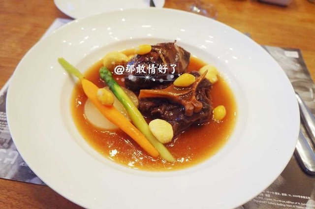 酱油炖牛尾配板栗,银杏,白萝卜及芦笋,牛尾肉带筋,却轻轻一剔就下来了可见烂的程度,一块儿是带骨牛尾,另一块儿用猪网油包着剔好的牛尾肉;