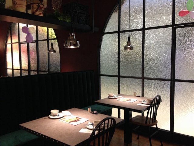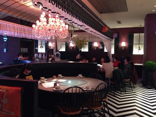 再往里面走右拐,可以看到另外一个区域,以大的圆桌分成了四个靠背的座位的区域,适合人多的坐的。座位上面掉有很好看的水晶灯。这个区域的左手边则是靠窗区域,右手边则是类似于包房的区域。旁边有假的壁炉的装饰,白色的墙壁,又有点欧式的感觉了。
