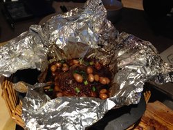 生烤脑花,16元。这道菜很是好吃,很入味的。用的锡纸来烤制的,脑花被佐料包围了,上面还放有花生。味道极好的一道菜,值得推荐。
