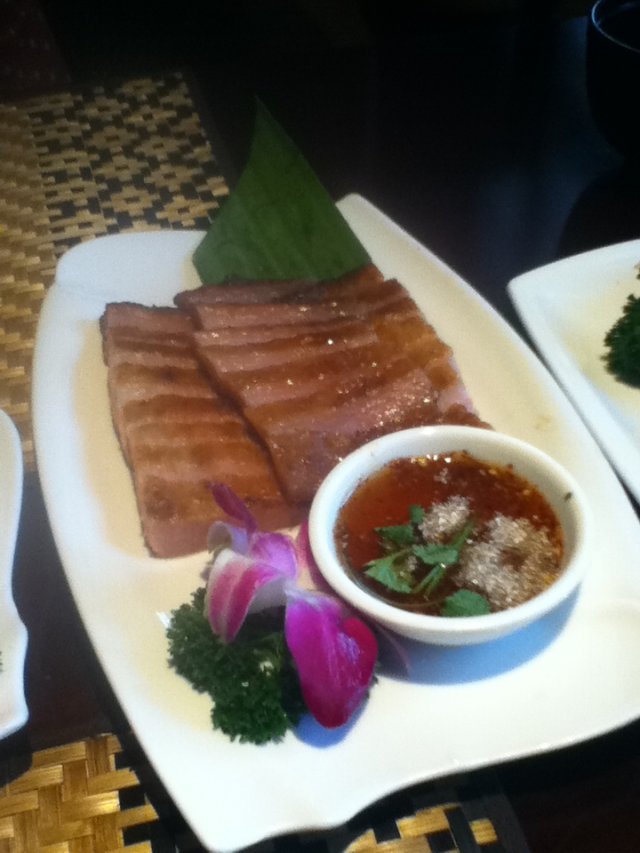 点了个香烤猪颈肉~配上的酱汁有着柠檬味,甜甜的·~肉很香,很嫩~肉肉很有弹性,咬上去外皮还脆脆的~猪颈肉配上那个酱汁,味道还不错~很好吃很香嫩~而不占酱也很香~很好吃~~