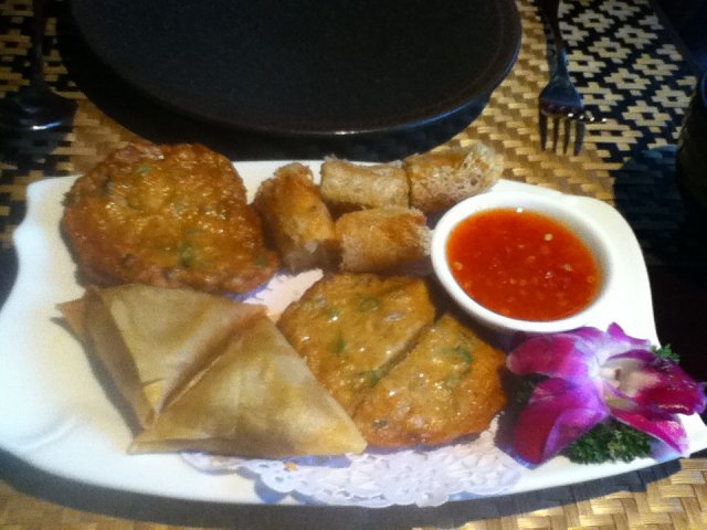 还点了盘点心的拼盘~~酸甜泰式酱汁真是大爱啊~味道很鲜美~其中一個是海鲜手卷,里面是虾肉~清爽的球生菜作外衣很鬆脆~配合里面卷着虾肉和蔬菜很鲜美很好吃~那个咖喱包味道也不错~咖喱味还算浓郁~还有的一个不知道啥名字的,觉得味道一般般,不怎么好吃~不太喜欢~整体的这个拼盘味道还是不错的~!