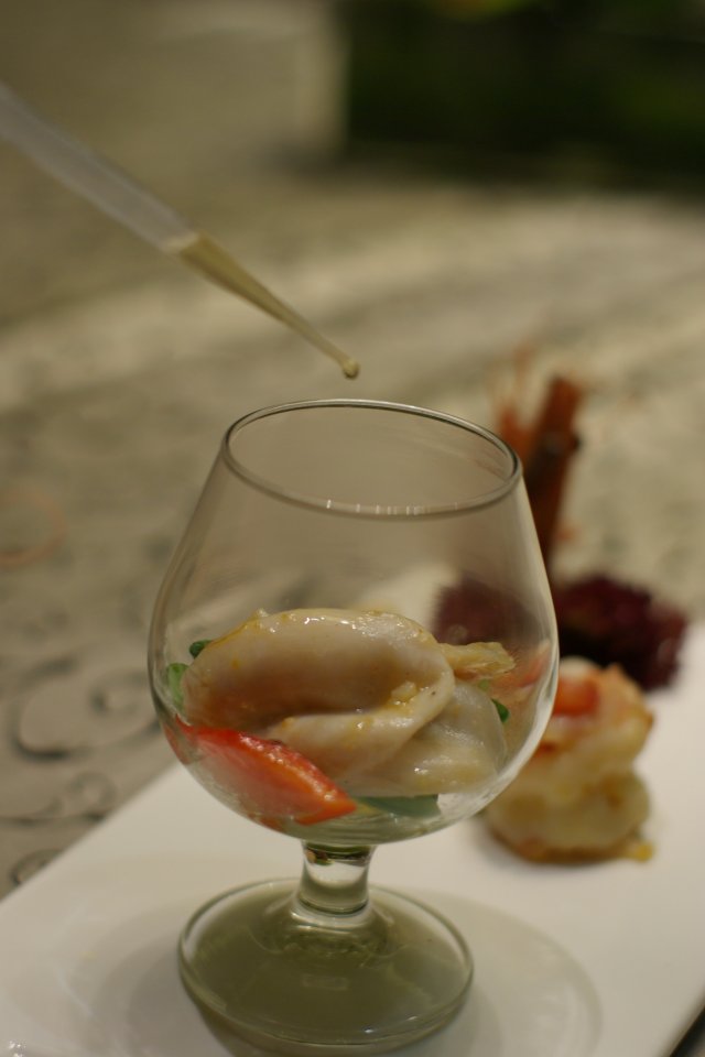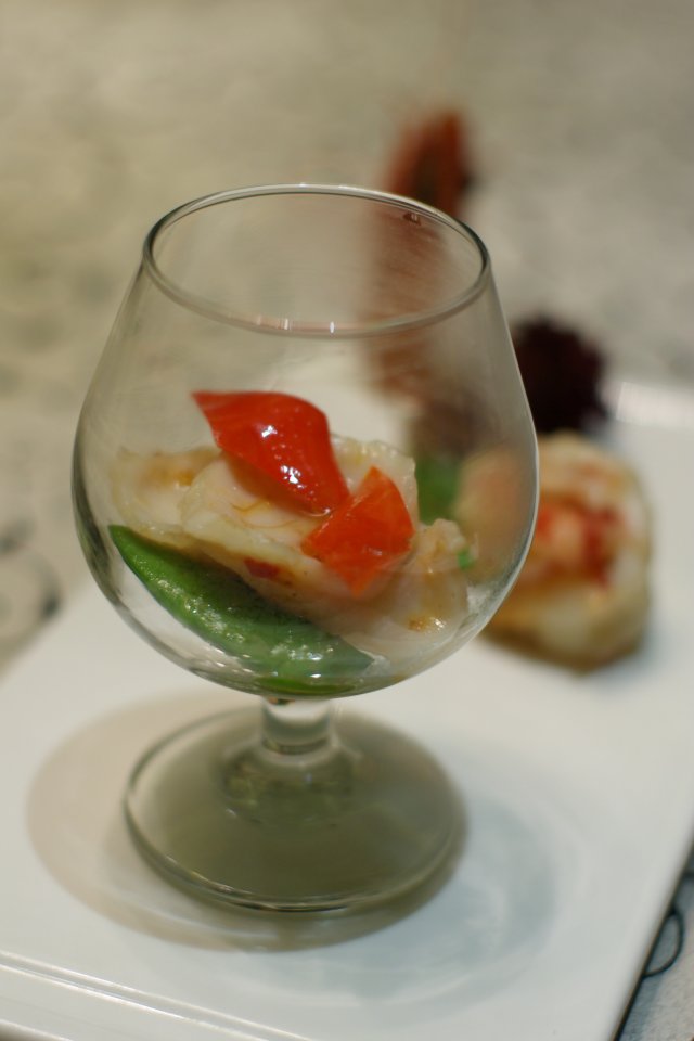 一个大口水晶玻璃杯中盛着几块大螺片,用以一试管的XO酒直接焦淋,趣味性十足,闻着酒香四溢,嚼着清脆入味,边上还有一大个蜷缩的大虾,QQ的实在感,柔韧性表现得淋漓尽致~~