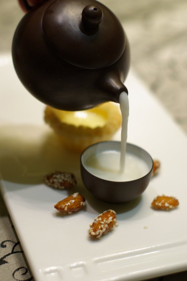 噱头十足的一道甜品,先用盛入杏仁露的小壶倒入小杯之中,小酌一杯,使得杏仁香溢入舌尖满布到味蕾,醇香留口,然后用杏仁点缀2粒到蛋白蛋挞之后倒入杏仁露,一口口食用,馥郁芳香的感觉,实在有美味~~