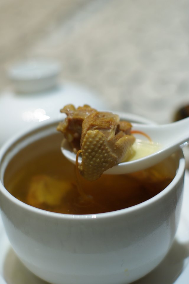 汤底清澈爽口,鸭肉酥嫩入味,没有丝毫腥味看,搭配虫草花,更是富于了色彩感,虽然经过数小时的熬制,但是淡雅的味道中渗出丝丝清香,回味中还略带甘甜之感,没有多余的浓重感,适合夏季食用~~