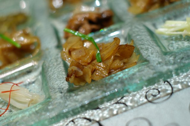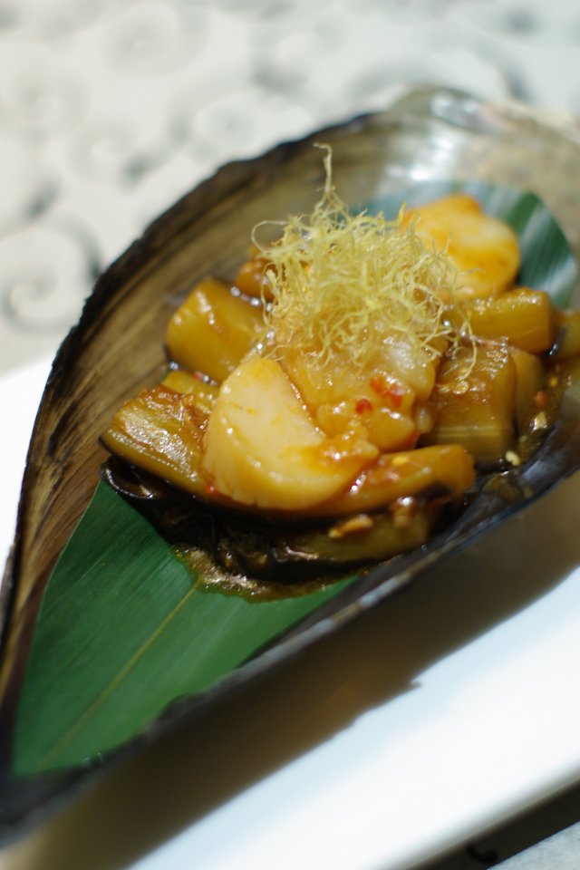 有是一道亮点菜品,用以一个带子壳作为容器,肥大的澳带鲜美多味,茄子香嫩入味,爆炒过的姜丝作为画龙点睛之笔,既美观又有去除海鲜寒性之功效,确实不错~~