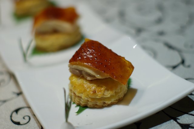 这道菜品色彩明亮,一大块经过烤制的清远鸡,外脆内嫩,垫以三层酥皮食用,实诚多味~~