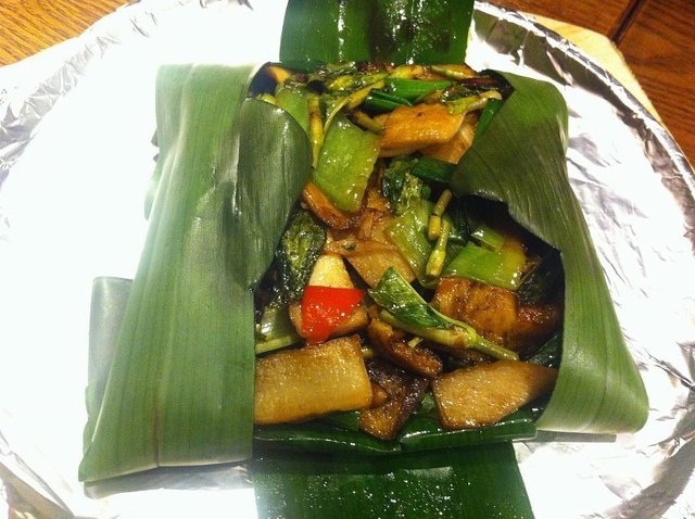 君临天下:荷叶包着的菌菇菜,一打开就香味四溢,入味好吃