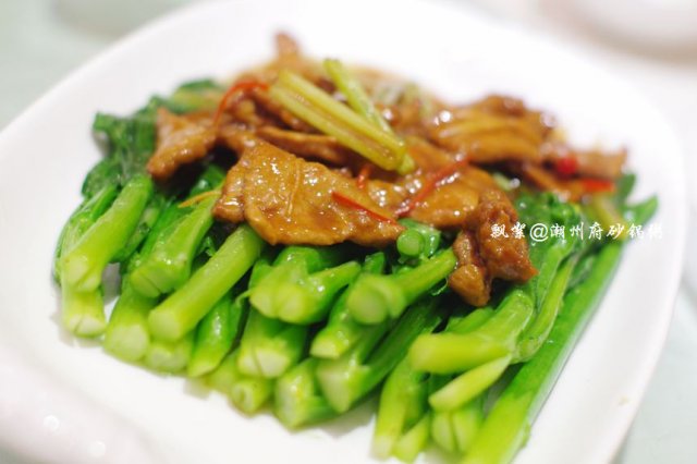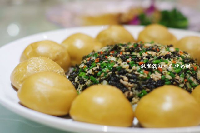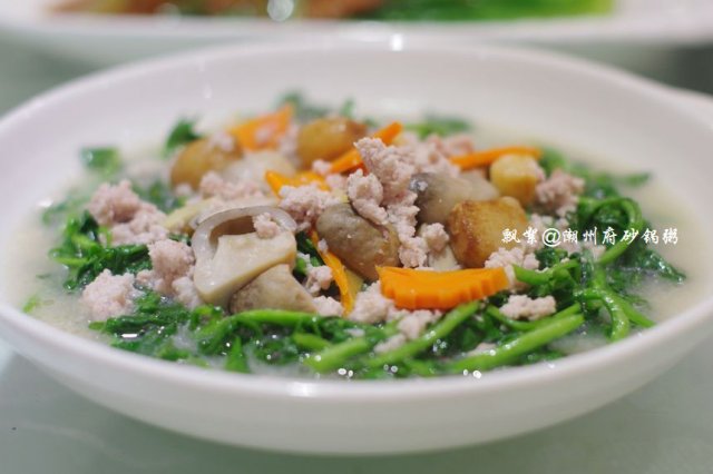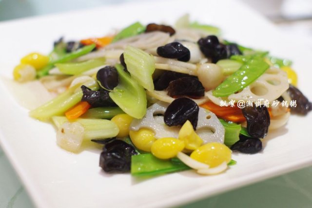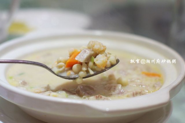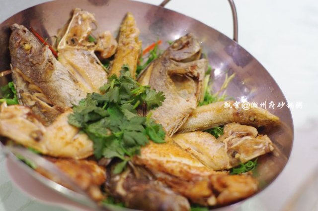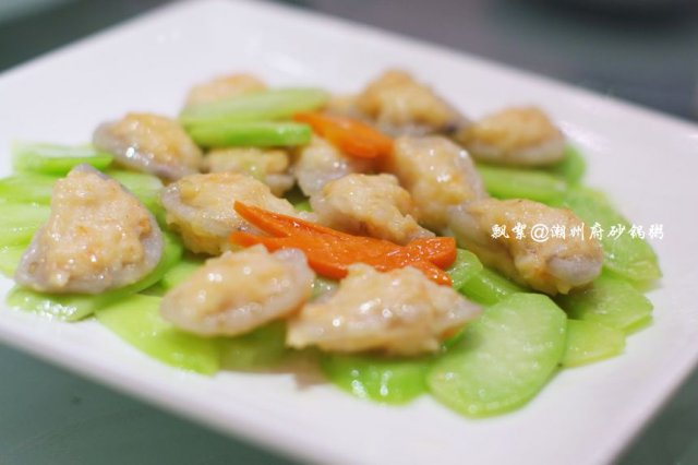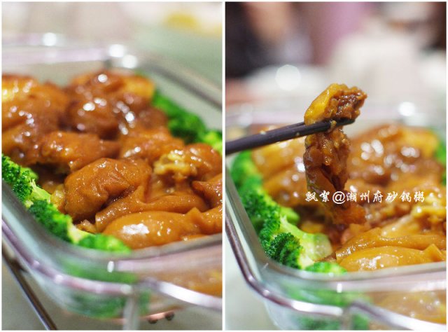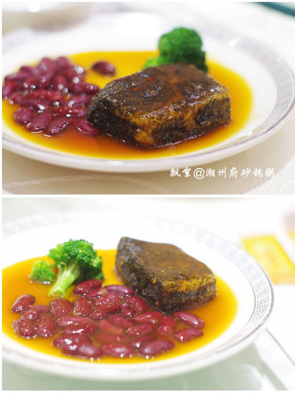 热菜点了肉汁大萝卜、潮式煎杂鱼锅仔、芥兰沙茶牛肉、荷塘月色、上汤西洋菜、红烧黄牛掌、潮州藕饼、鲍汁芝麻豆腐、香芋芡实煲、沙姜猪肚、鲜虾紫菜松,其中红烧黄牛掌感觉很有特色,以往吃过的类似的菜肴都是选用的猪蹄,而它家则用黄牛掌取而代之,最美味的要数牛筋腩了,就是介于皮下脂肪与肉之间的那一层,脂肪少,口感较滑,肉质较嫩,咬上去不粘牙,烧制得亦蛮入味的,也很软烂,牛筋Q糯腴润、牛肉软嫩多汁,十分顺口;潮州藕饼,造型很讨巧,做成了可爱的饺子型状,中间一层是连藕,两边则裹着一层虾肉泥,咬一口,外面的虾肉QQ的,很弹牙,连藕则多了一份爽脆,与芥兰片与胡萝卜片同炒,色面上亦加分不少呀,嘿嘿!香芋芡实煲,十分经典的一道潮州菜,量蛮大的,汤呈乳白色,应该是加入了牛奶煨制的,此汤不仅营养健康,且新鲜味美,芋头绵软,芡实粉糯,虾仁Q滑,绝对是一碗不过瘾的美味哦!