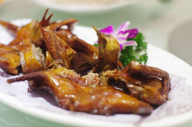 冷菜点了冻乌鱼、卤水拼盘、潮州咸菜口、冰镇花螺、爽口木耳和琵琶乳鸽,其中冻乌鱼是颇具潮州特色的一味冷菜,选用黑鱼,采取了冰冻的手法,这样可去除鱼腥,保留鱼肉的甜美,配上普宁豆酱佐料,风味尤佳;冰镇花螺摆盘蛮讲究的,螺肉看上去密密麻麻的,食材倒是十分新鲜,入口爽滑脆嫩,与日料的吃法类似,需蘸些芥末与酱油;琵琶乳鸽不仅色面佳,而且POSE也拗得好。夹起一块香喷喷的鸽肉尝之,感觉牙齿在与其触碰的瞬间,脆皮弹牙,肉嫩细腻滑口,带股诱人的焦香味。