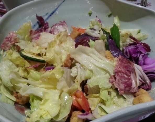 4、大拌菜:挺大的盘子,份量太小了点,都快垫底了,但价格是超贵的,里面有坚果和干果倒是少见哈,可能是西餐式的做法,因为放的是沙拉酱,酱味不错,整体口感上稍微有点干了。