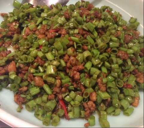6、某空心菜:感觉就是肉末炒空心菜嘛,炒得不错,切成很小的段段,肉丁很嫩,空心菜量很多,配米饭吃不错,咸香适中,略微带点辣味。
