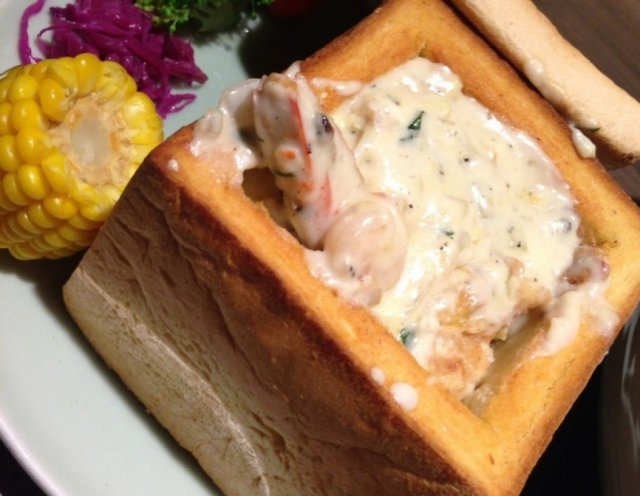 5、海鲜面包盒子:这个惊艳些,面包体挖空成方盒子状,里面有大虾、有土豆泥、有蔬菜有满满的奶油芝士,挺香浓的。