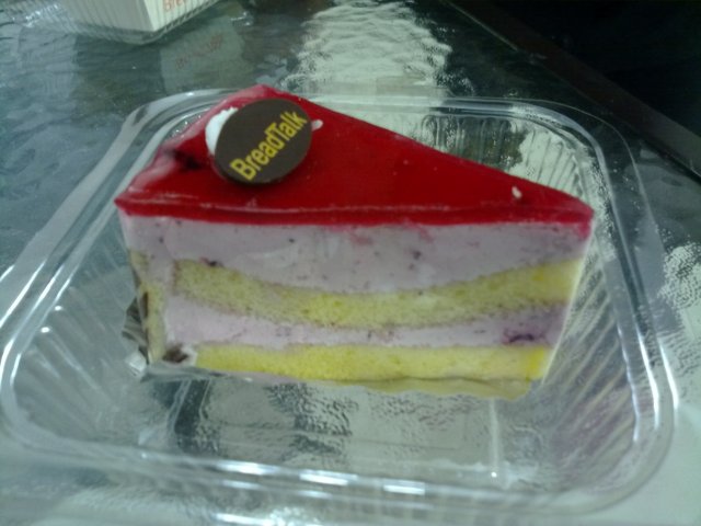 草莓慕斯切片:上面红色的壳不是果酱哦,是草莓味的果冻,酸甜口味的,我喜欢。