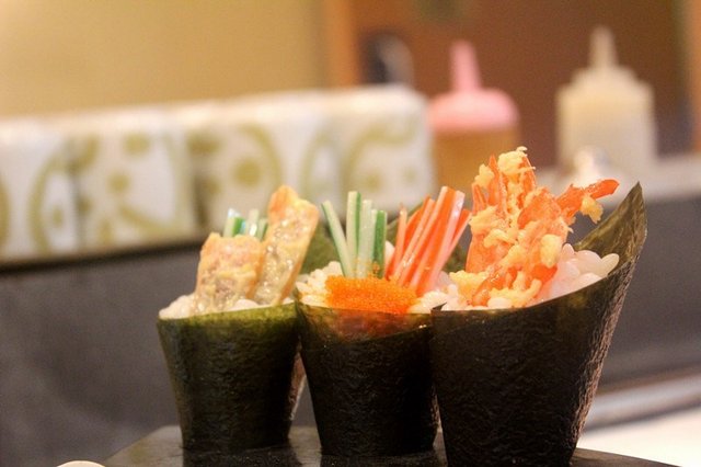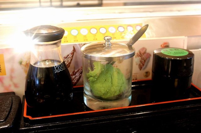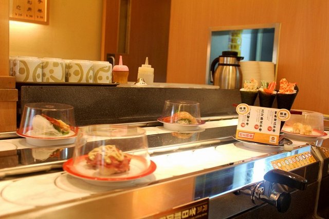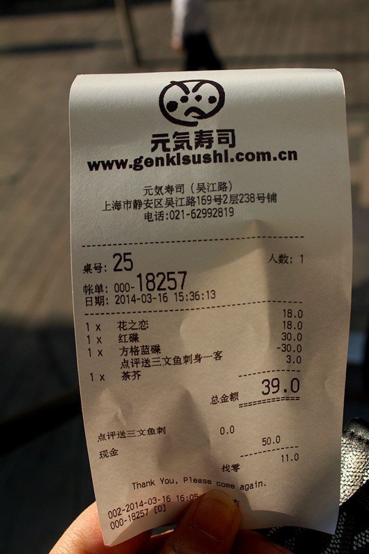 周末公园逛好附近找吃的 下载了点评的优惠短信 任意消费送价值30元的三文鱼刺身一份 于是就这家咯 环境还不错 香港之前也有看到这家 上海现在分店也陆续开起来了 品质不晓得有没有差距 茶位费要每人3元,是结账的时候才发现的,这个其实应该事先告知吧 传送带上的寿司没有6元的,8元的也很少,大都是10元及以上的 火炙系列的寿司味道还不错 花之恋造型凹的漂亮 三文鱼做成花朵的形状,寿司米藏在地下,表面是沙拉酱,最上层撒的鱼籽 鱼籽脆脆的 没有腥气 这点不错 送的三文鱼有四片 品质也不错的 想着随便吃吃 结账下来只要39块 还是划算的 和回转寿司店是一样的 自己取抹茶粉自己倒水 抹茶水一直都还蛮喜欢 wifi一直连不上