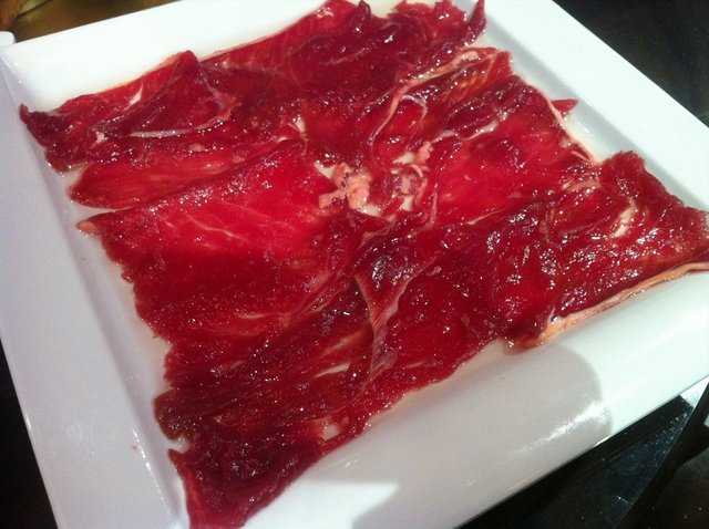 牦牛肉。新品喜人的红色,可见肉质上称、新鲜。因为片薄,所以很好熟。牦牛肉,脂肪含量少,肌肉也扎实,所以口感是那种偏硬、不太好嚼的。个人还是喜欢老款的嫩牛肉哈