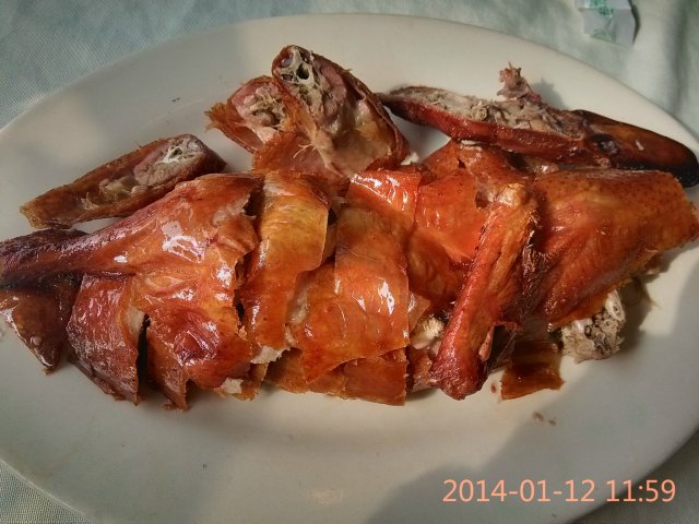 烤鸭很快上桌,晶莹剔透,闪着醉人的油光。