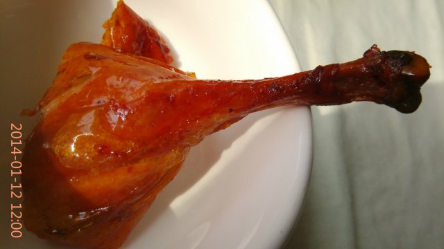 夹起一个鸭腿,鸭皮烤得金黄透亮,和鸭肉已经分离了。
