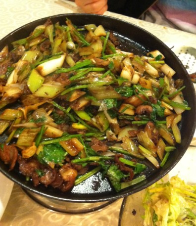 贝勒烤羊肉:里面羊肉不多,但是一点都不膻,稍微有点干。里面的配菜不少,葱蒜都不辣。