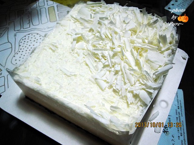 外面绑的丝带是荧光色的,打开一看,一磅的雪域蛋糕看起来比较小,基本可以分为四块。上面是屑屑头一样的白巧克力片。再是奶油,下面是芝士,最底部是黑色的薄蛋糕底。