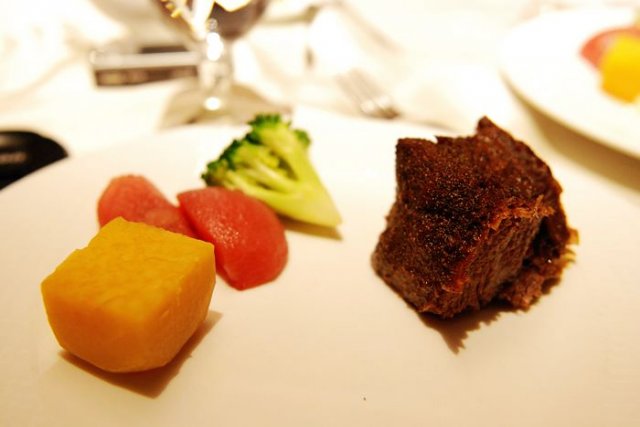 主菜台塑牛排,两个人分一份一般够,配上切好的蒜片,否则有点腻,浇汁有辣和不辣两种,配菜有西兰花、红酒梨、红薯,店家很贴心的服务,不论你要把牛排分成多少份,每人都是一模一样的大盘子和同样的配菜,真的不差这点,可很舒心。