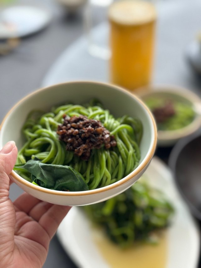 吃了這麼多,感覺要配點米飯才夠飽。套餐有清波擔擔麵🍜非常特別,青綠色的涼麵有肉碎,真滋味。