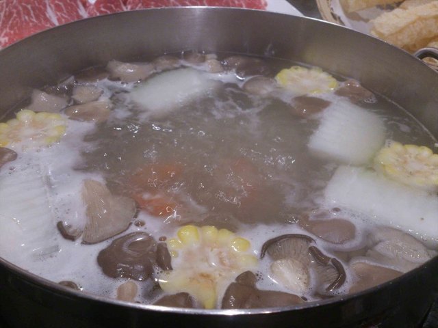 小锅里面料不少噢 玉米、冬瓜、菌菇 清淡的鲜味~