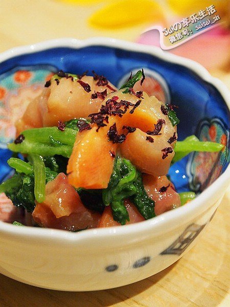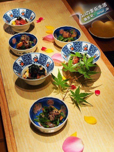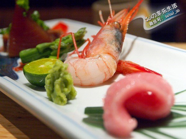 刺身,算不上华丽丽也够精致了,有上等甜虾,肉质饱满,吃得出的新鲜;粉色的金枪鱼大toro,只能说是入口即化,一片点到为止;颜色呈绛红色带有光泽的是鲣鱼,平时吃章鱼小丸子上面飘动的木鱼花就是鲣鱼做的,用火炙烤过的表皮熟里面生的鲣鱼刺身还是很少吃到,生的部分能感受它原味,炙烤部分出于杀菌提鲜之用;用了手磨山葵,品质优;