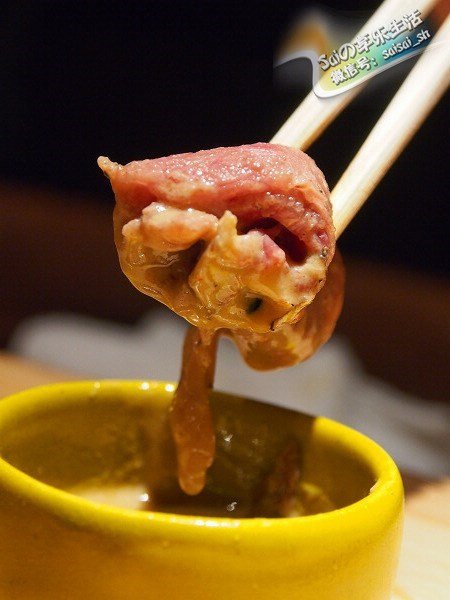 怀石料理有它一定的上菜顺序和章法,这是吃到中后场了。和牛依旧是主角,关西风,用了但马牛肉,在石板上保持一定温度,当中夹杂了舞茸,沾上特调花生酱,舞茸本身也吸收了牛肉的汁水变得更为鲜美,色香味形俱佳。