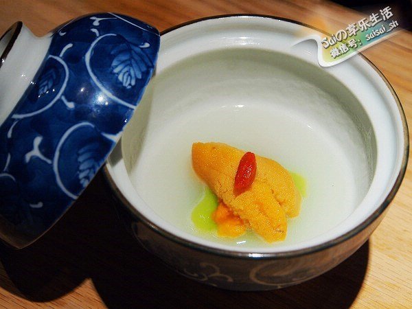开胃菜盛放在青白色瓷碗中,揭开一看当中横卧2枚马粪海胆,甘甜肥美;红色的枸杞作为topping,第二层是蚕豆豆腐,蚕豆泥混合的味道,用了最为时令的原料,吃出春夏的感觉,底部是白色的铁棍山药泥加上葛粉,带有点小粘稠,颜色由浓入淡,味道总体清淡;