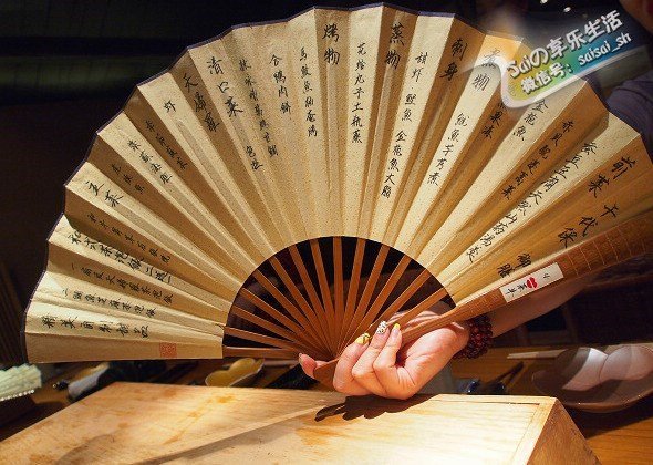 烤物的厨房透明可视,围着的是一排吧台,另外一隅是可以坐10人的下凹式tatami,当中有2个呈现台,纯木的,只要料理上桌,所有的焦点都汇聚于此,光影的作用加上精致怀石料理的体现,让人有很好地视觉享受。扇子打开娟秀的字体写着今天的菜式,每个月都会根据时令的不同更换套餐的品种,怀石料理的精髓也在于此。