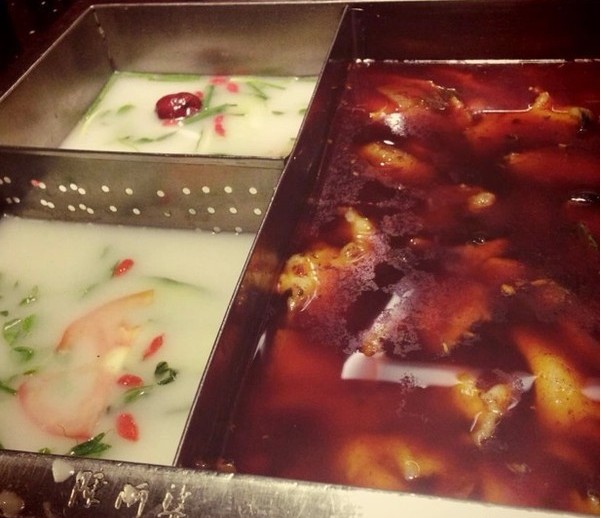 1、锅底与小料:麻辣锅底味道浓郁,确实也够麻够辣,白汤颜色呈现奶白色,里面下料丰富,西红柿,菌片,香葱,涮锅前可以来一碗尝尝鲜,比较清淡。小料是自取,人比较多,香油料很香不油腻,青椒酱很好吃,香辣辣的。