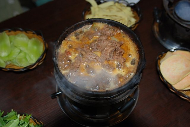 吃完了煲里的肉类,就可以涮各种素菜,最后再来碗米饭拌着煲里的汤,相当完美的一餐。