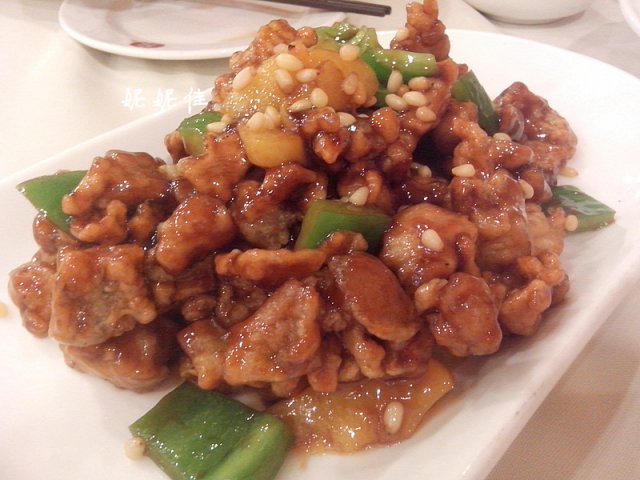 松香脆皮鸡32米:这个很是推荐,鸡块炸的酥脆,调汁用的是醋,醋香逼人,却吃不出醋的酸,甜的可口却不腻,还和黄桃共炒,洒上松仁,性价比很值。