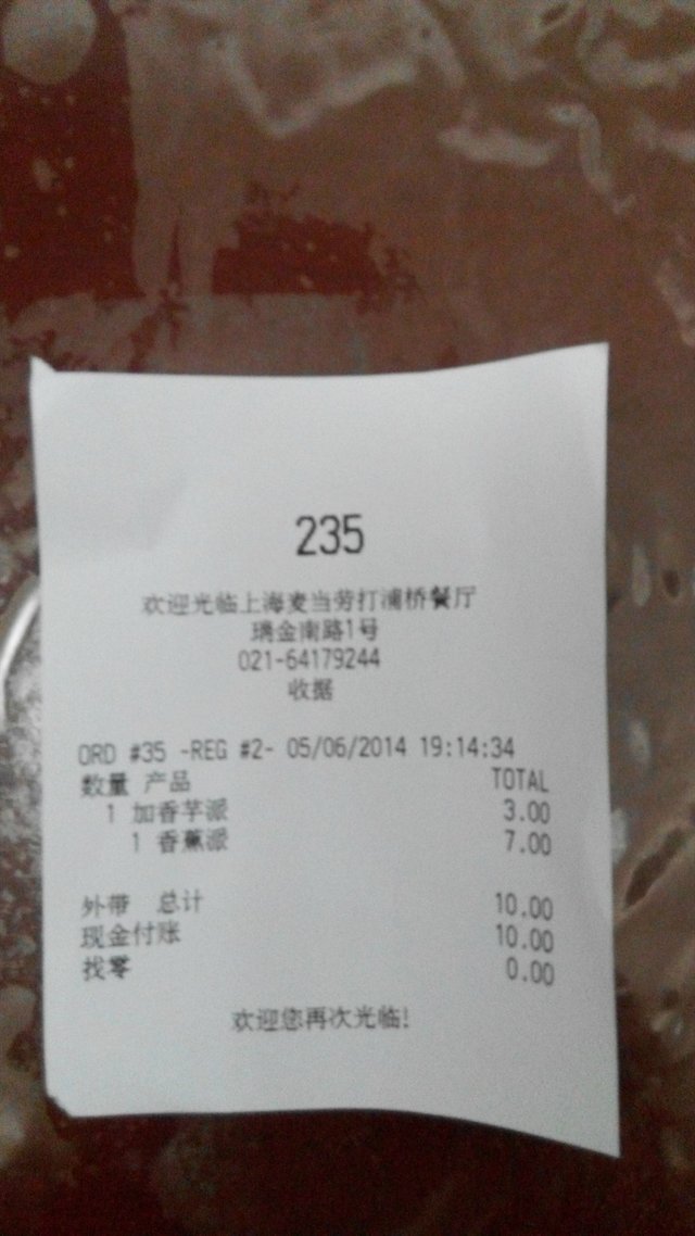 麦当劳 阿德哥等級42014-06-059 瀏覽 關注 麦当劳,这家店就在打浦桥,我走过去蛮近的,门面蛮大的,环境还不错,就是灯光暗了点。 帮我女儿买明天的早饭,她喜欢吃派,新出来的香蕉派买了一个尝尝味道,都是新鲜做的,材料蛮丰富的,明明点了香芋派,却给我菠萝派。。。:(服务员实在太粗心了,回到家才发现的,哎,算了,我也不计较了。。。香蕉单点一个10元,再加一个菠萝的10元,性价比一般正以上食評乃用戶個人意見 , 並不代表OpenRice之觀點。讚好分享麦当劳 麦当劳 https://s.openrice.com/KtbT100LGmB00檢舉 張貼 評分4味道4環境3服務4衛生3抵食推介美食正人均消費¥10 (早餐)