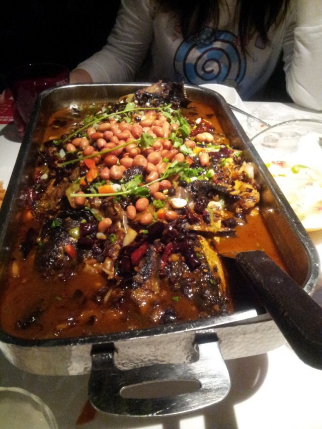 我们点了一份烤鱼,超级辣,鱼不是很大,我们两个不嫌多,但是很入味。我觉得没有江边的烤鱼好吃