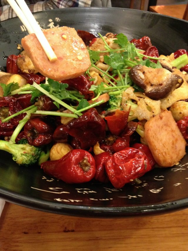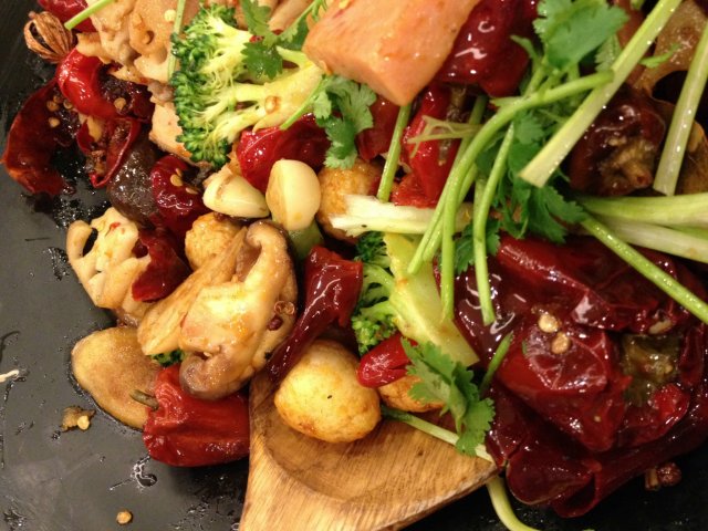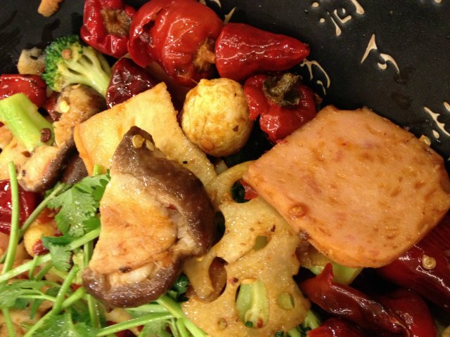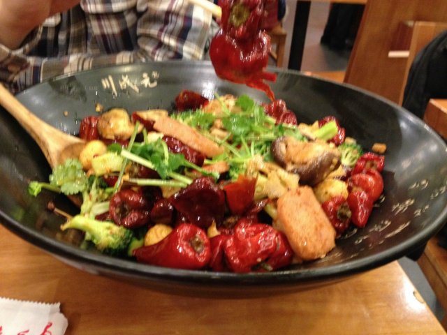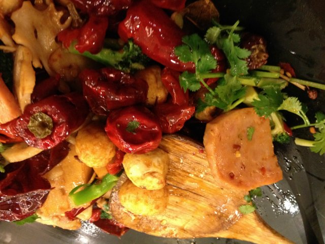 很大的一锅,里面灯笼椒可是不少,麻椒也很多,还有香叶等其他的配料,配出这一锅香喷喷的辣锅,相当下饭,也解馋。